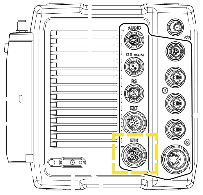 The Alexa Mini LF provides 24V DC and Ethernet via a single Lemo connector at the rear of the camera. The power provided is sufficient to power the bitbox, though we cannot recommend or advise using other accessories with this port. The Mini LF Ethernet port is in a fairly cramped area at the back of the camera, if you have issues fitting a normal Lemo connector, we recommend our Anglissimo rotating Y-Cable.
