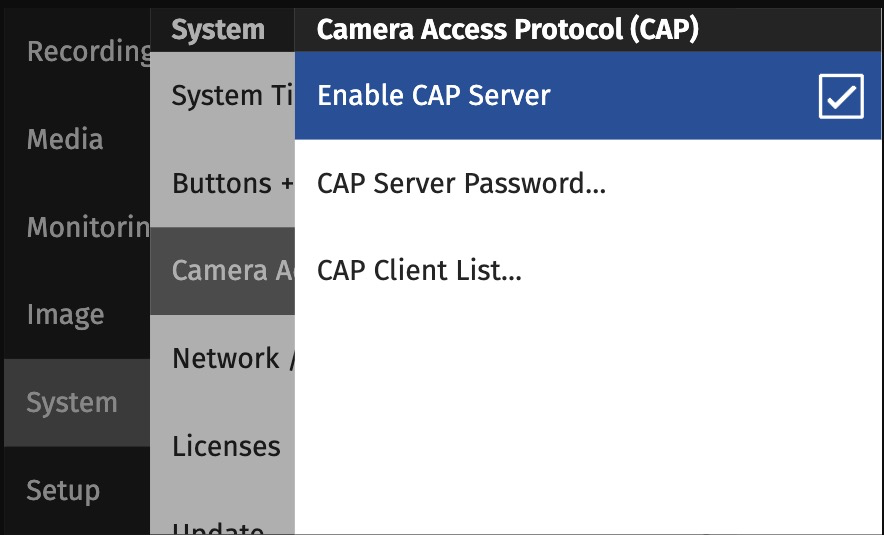 Menu→System→Camera Access Protocol (CAP) - Enable CAP by setting the